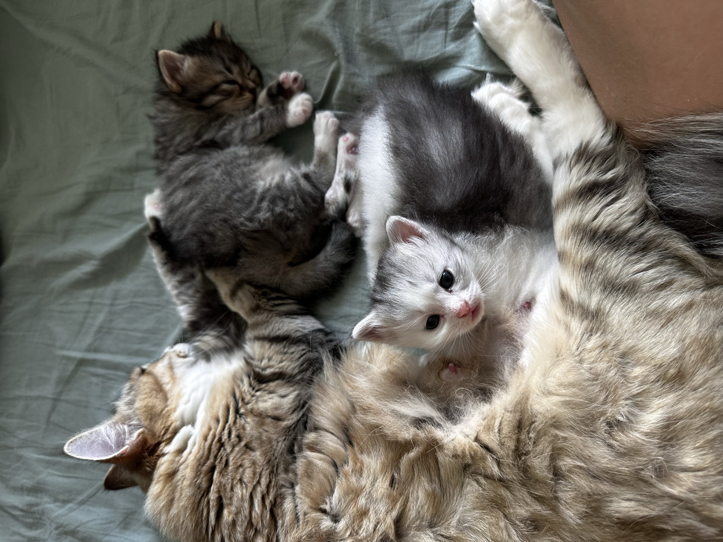 Mamma till kattungarna är SE*Sailons Chardite’s Kalypso, en energisk, mycket kelig och nätt sibir av färgen SIB f 09 24, svartsköldpaddspotted-vit.